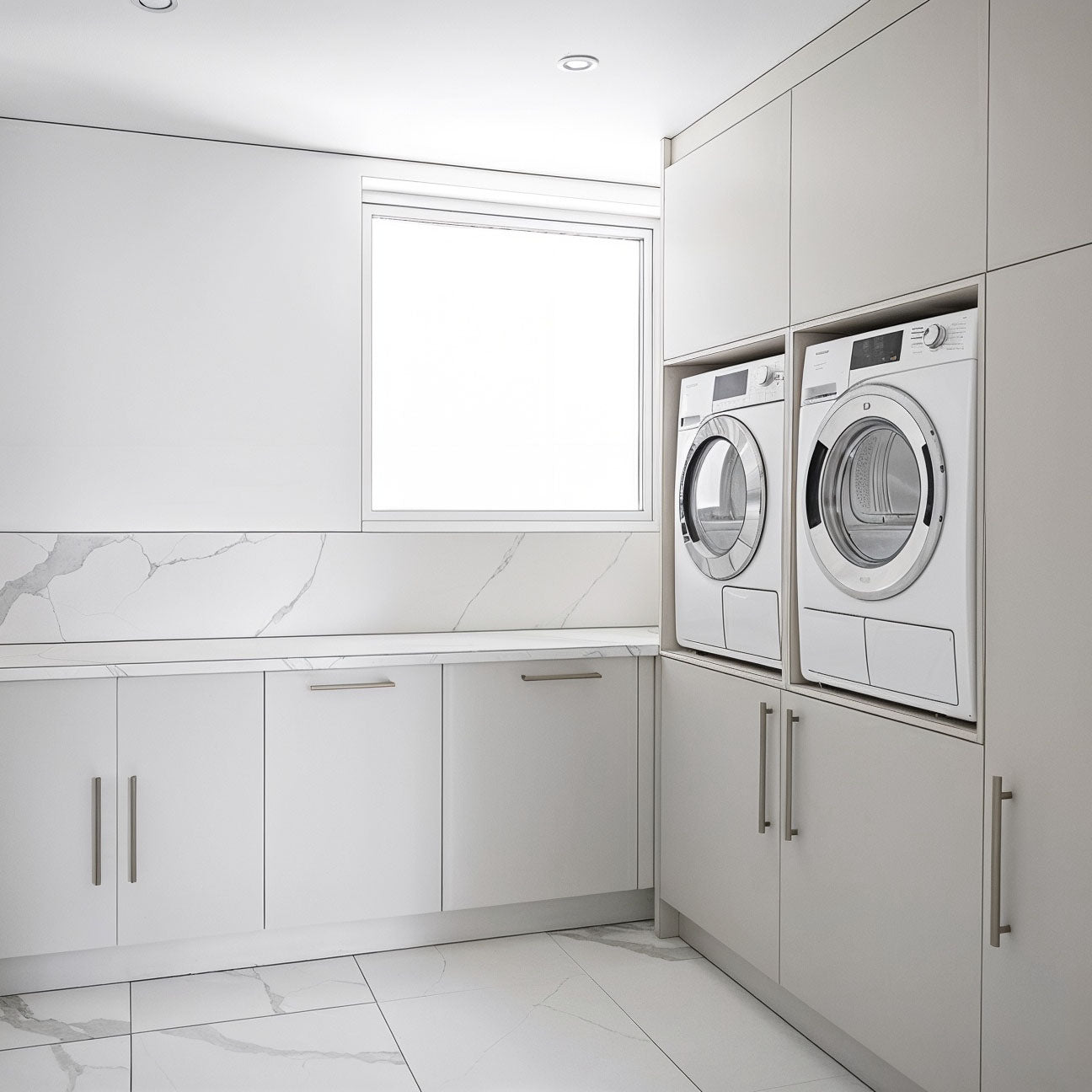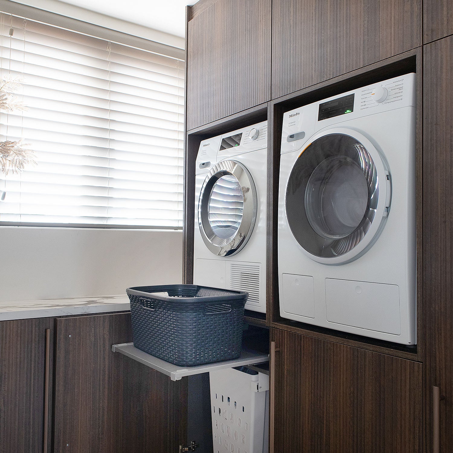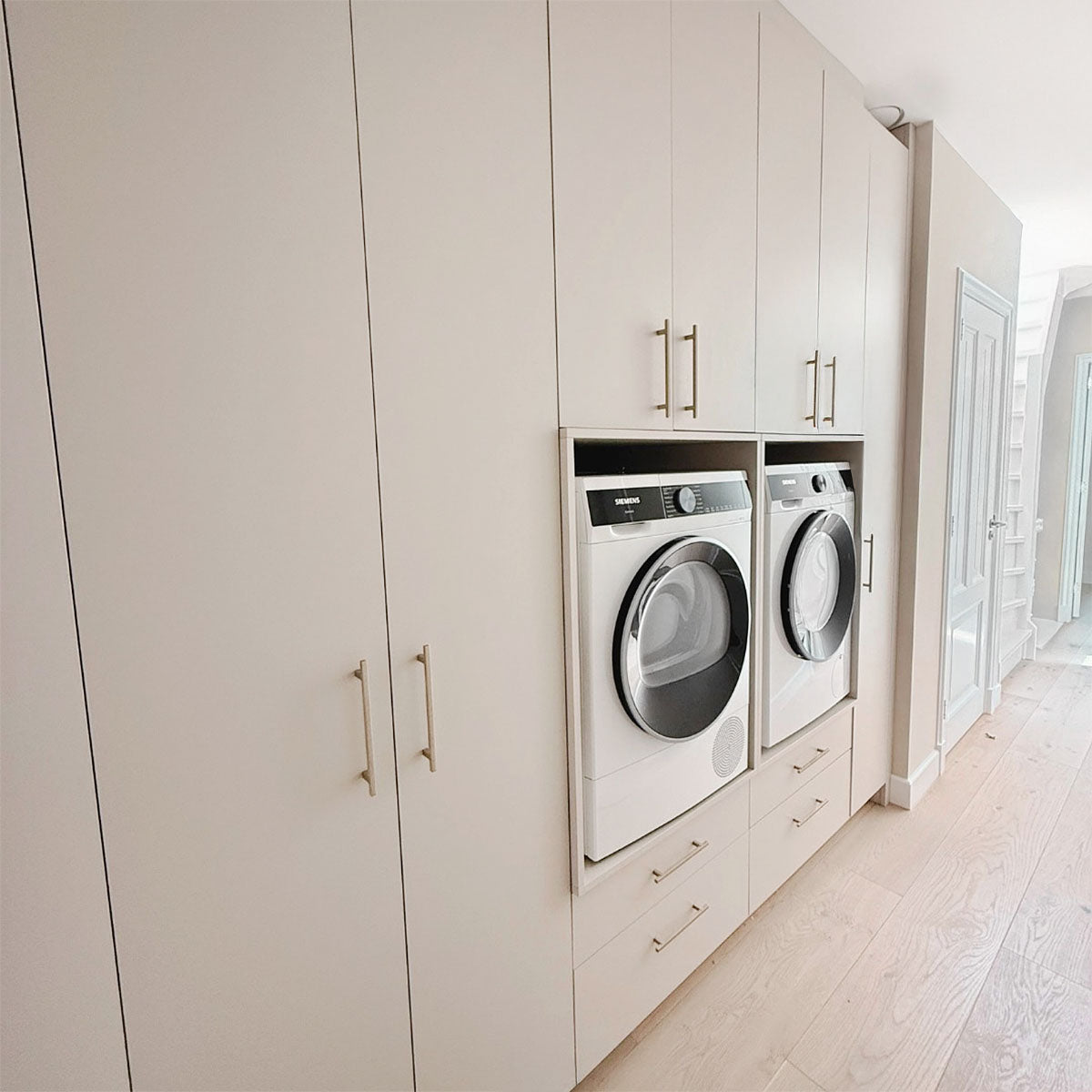 Creëer moeiteloos jouw ideale wasruimte, helemaal afgestemd op jouw stijl en ritme. Deel de kast in met nissen voor wasmachine en droger, extra planken voor wasmiddelen en handige lades voor accessoires.