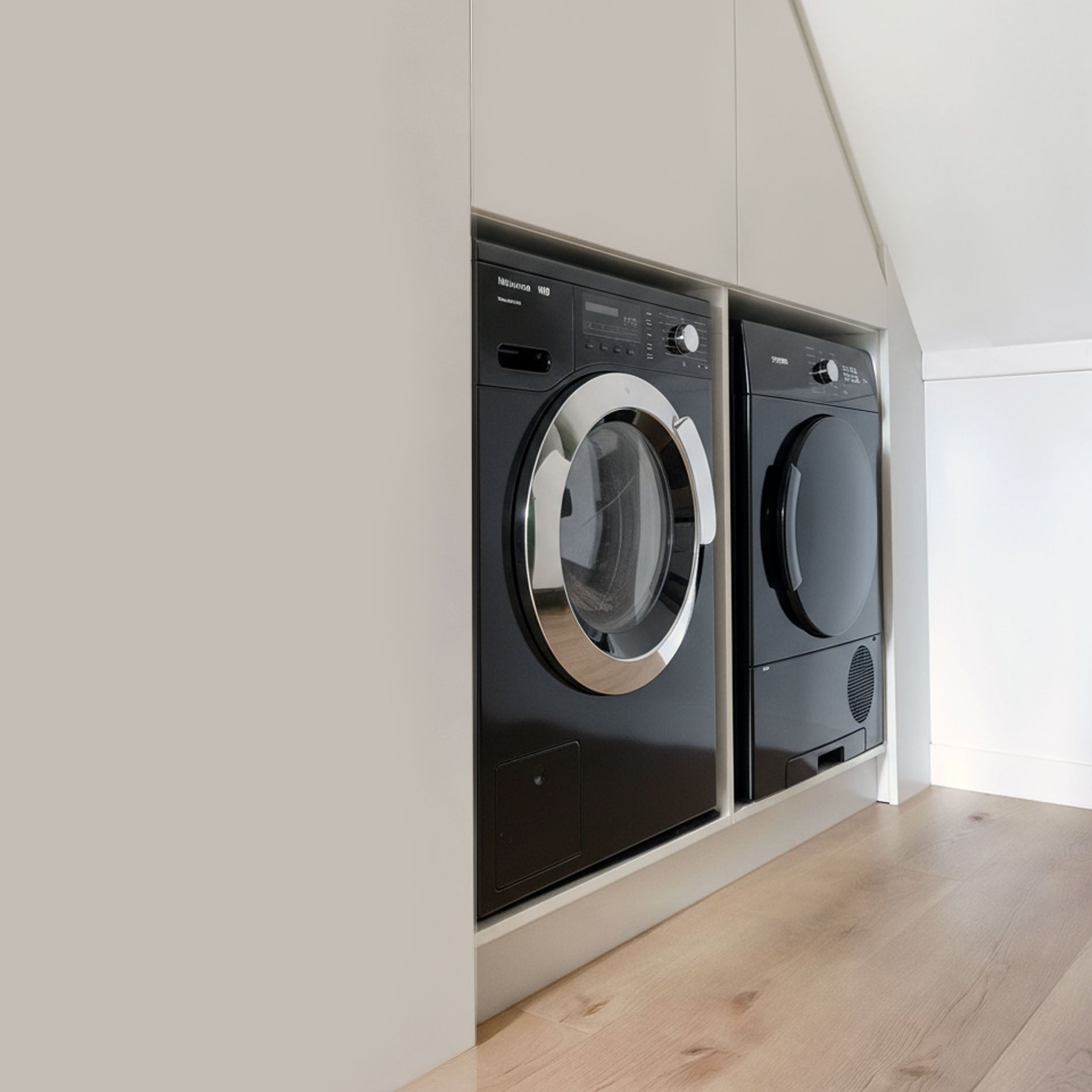 Of je nu je machines wilt stapelen, extra opbergruimte zoekt of een kast nodig hebt onder een schuin dak: wij maken jouw ideale wasmachinekast mogelijk. Slim, strak en precies zoals jij het wilt.
